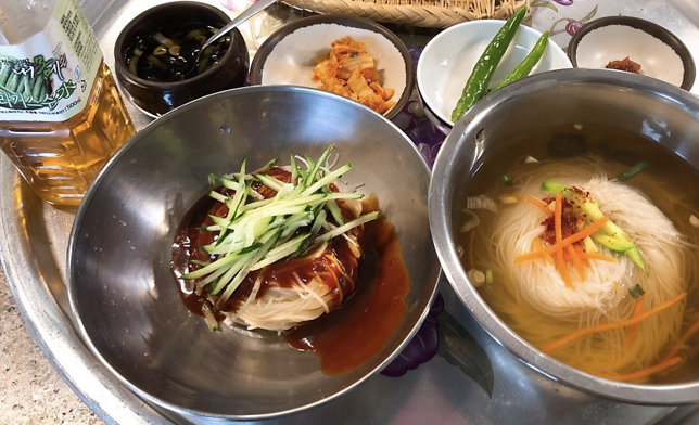 잔치국수는 진한 육수에 새콤한 김치를 올려 먹으면 그 맛이 일품입니다. 양념장과 채 썬 오이만을 올려낸 비빔국수는 양념장에 멸치 육수를 넣어 감칠맛을 더했습니다. 잔치국수 3천5백 원, 비빔국수 3천5백원, 냉국수 4천5백 원입니다.